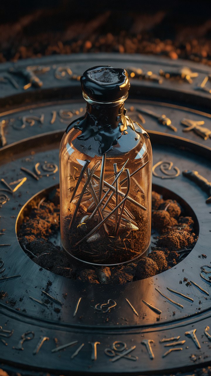 Bougie blanche ; terre ; épingles ; clous ; café ; bougie noire ; photo ; aiguilles ; poivre noir ; girofle ; oliban ; allumettes ; punaises ; poivre blanc ; bouteille en verre